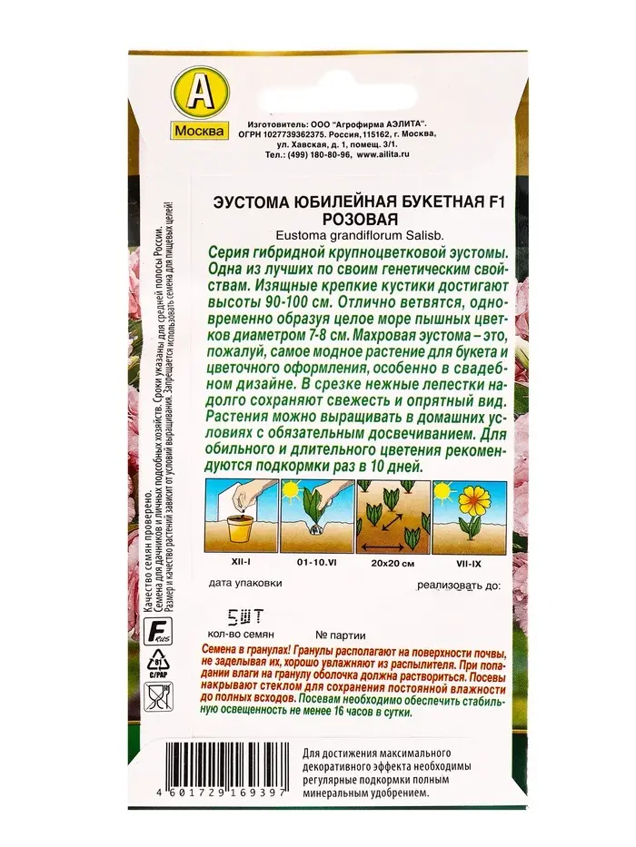 Семена цветов Эустома Юбилейная букетная F1 махровая розовая (драже) , Ц/П,5 шт.