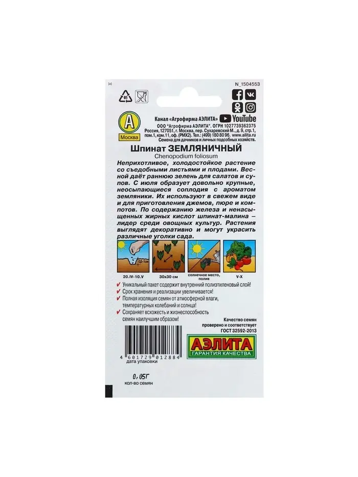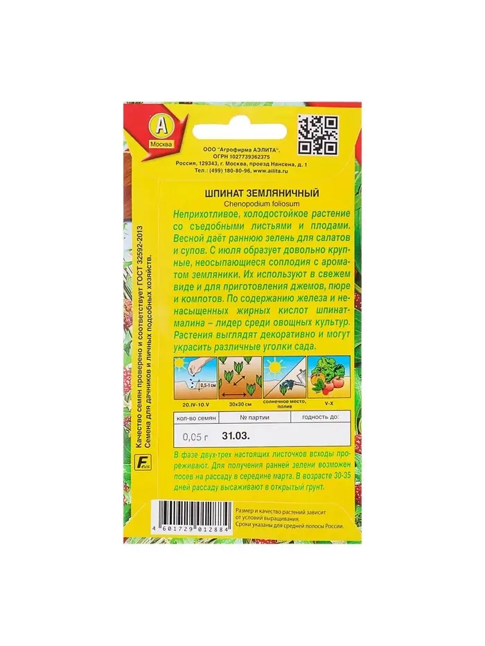 Набор семян Шпинат "Земляничный", 5 шт.