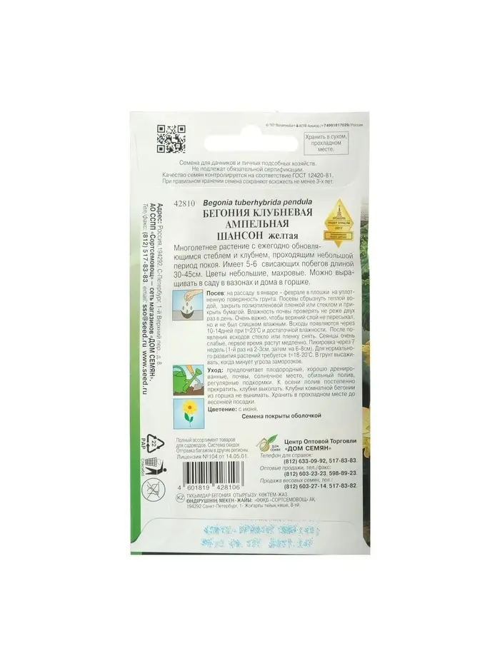 Набор семян Бегония ампельная "Шансон" клубневая, желтая, 5 шт.