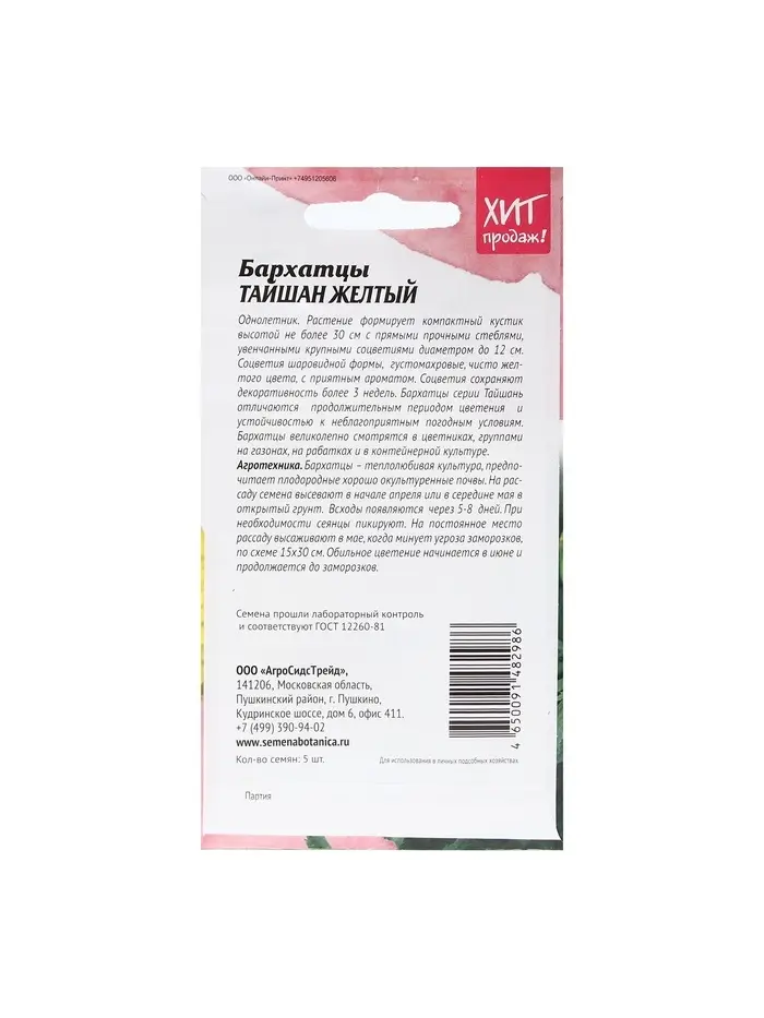 Набор семян Бархатцы "Тайшань желтый", 5 шт.
