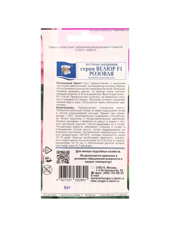 Набор семян Эустома махровая "Велюр", розовая, F1, в ампуле, 4 шт.