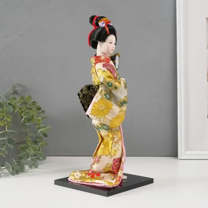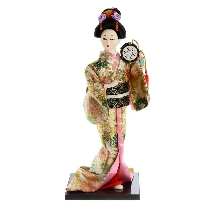 Кукла коллекционная "Гейша в шелковом кимоно с барабаном" 22,5 см пусть и не сможет поддержать беседу, спеть или станцевать, зато точно развеселит или даже удивит вас и ваших гостей. Вы только посмотрите на великолепное одеяние, причёску, позу, выражение лица... Авторам удалось передать всю прелесть и красоту этой японской дамы. Элегантное традиционное кимоно расшито цветной тканью: поистине ювелирная и кропотливая работа. Волосы собраны аккуратно и украшены маленькими, специально созданными для этой куколки аксессуарами. Мелкие детали — вот что ценят многие коллекционеры. Пусть эта красавица озаряет ваш интерьер своим присутствием изо дня в день.