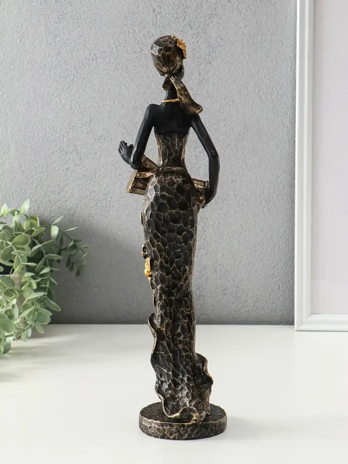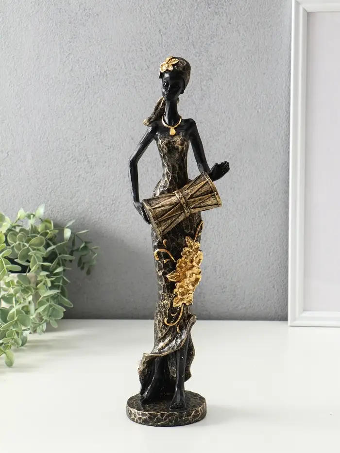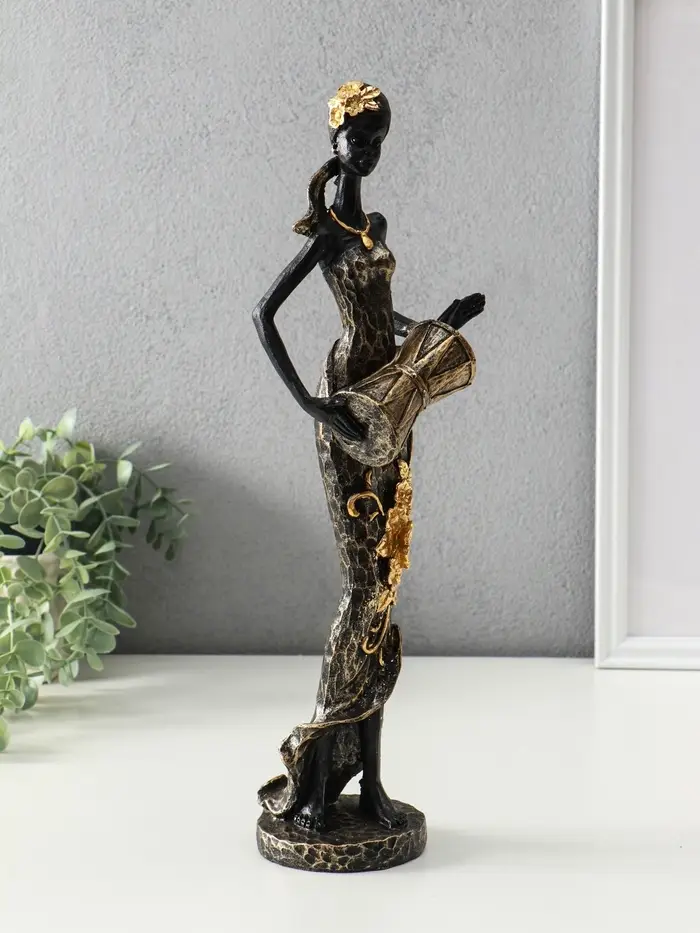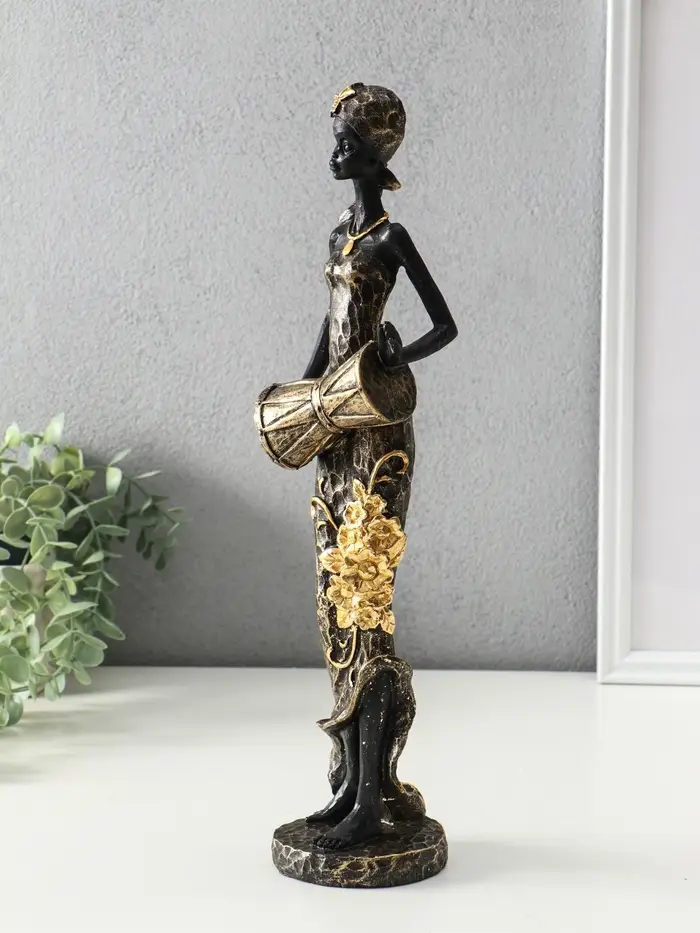 Сувенир полистоун "Африканка в косынке с цветами и барабаном" чёрный 8,5х8,5х39 см