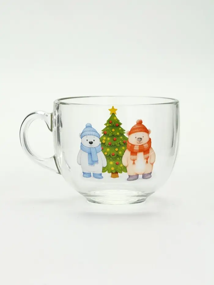 Кружка «Мишки в лесу» — это зимний лес, умещённый в прозрачное стекло. На фоне чистой поверхности — два мишки у ёлки: живые, чуть неуклюжие, с мягкими контурами и тёплыми тенями. Никаких надписей, никаких дат. Только сцена — тихая, как первый снег, и такая же настоящая.