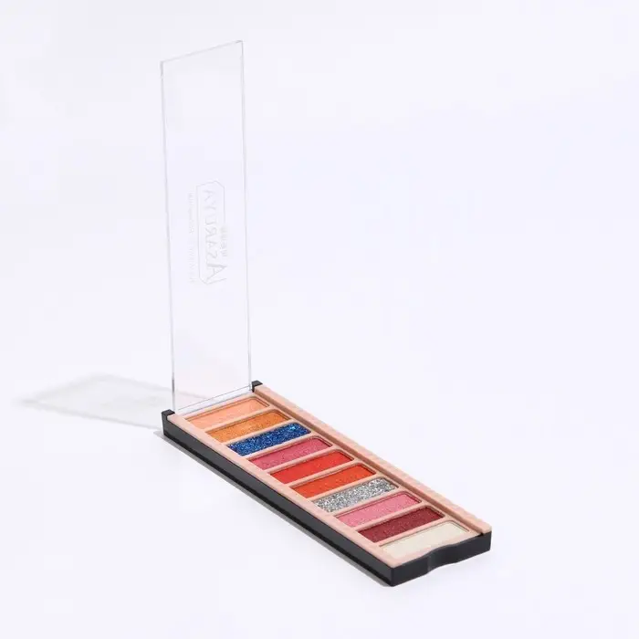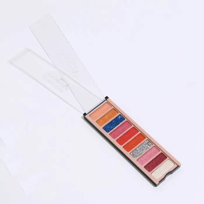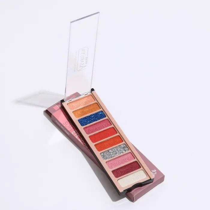 Палетка теней имеет удобную форму и хороший выбор цветов, в том числе блестящих. Тени хорошо пигментированы, не пылят, не скатываются, отлично тушуются и наносятся на веки.