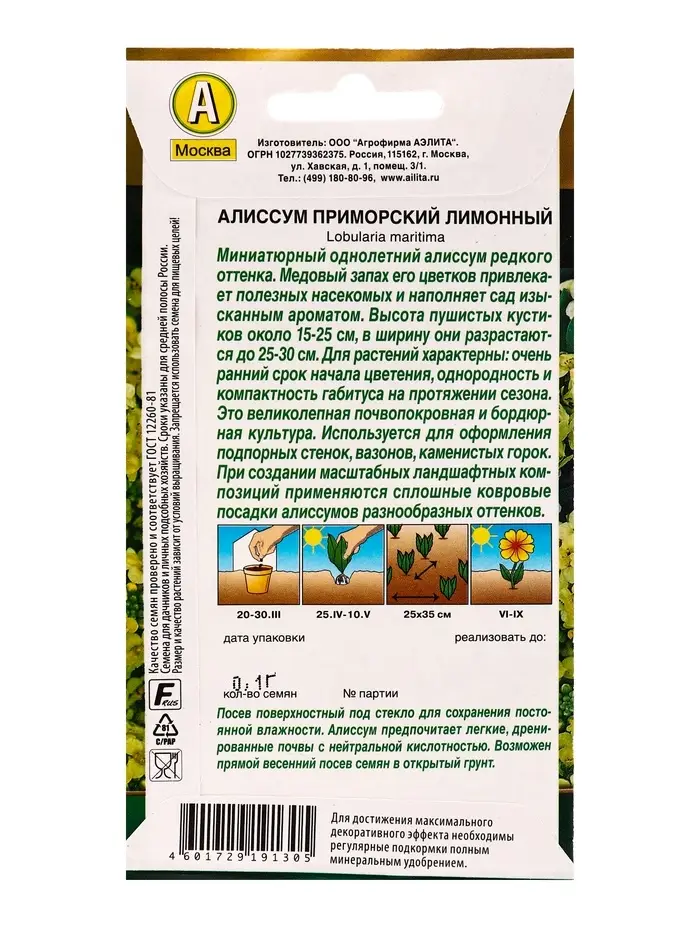 Семена цветов Алиссум приморский Лимонный Золотая серия, Ц/П,0,1 г