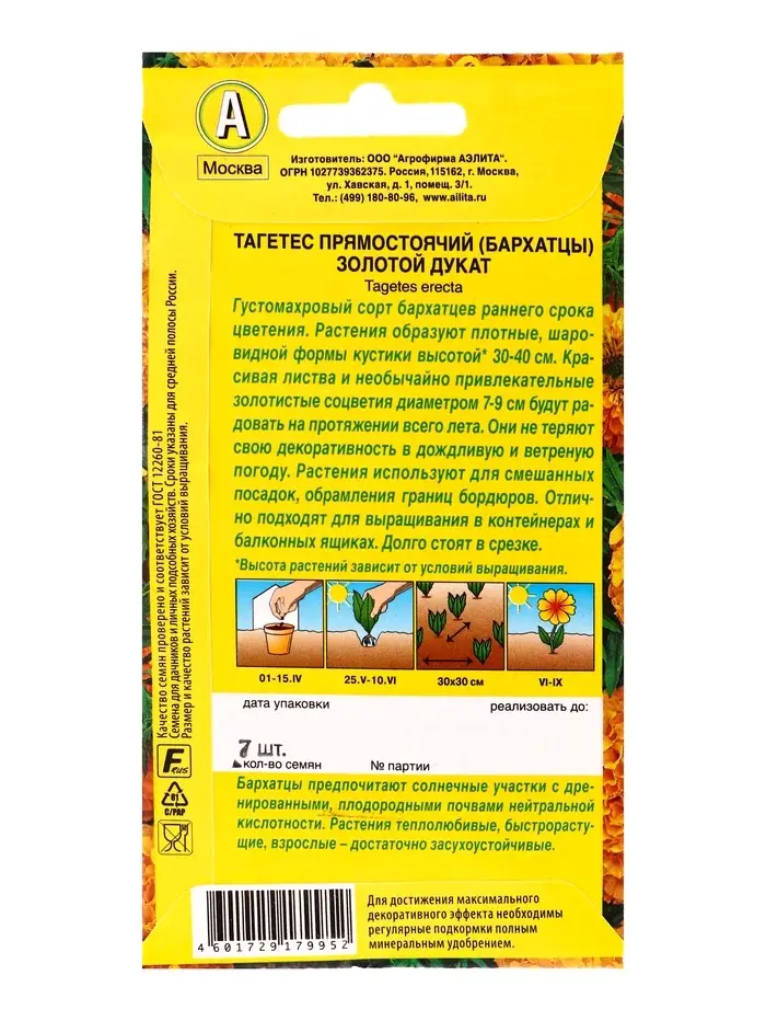 Семена цветов Бархатцы Золотой дукат прямостоячие , Ц/П,7 шт.