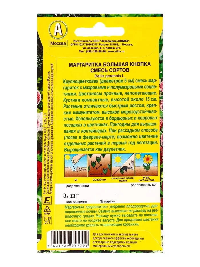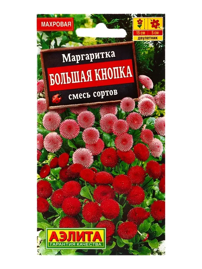 Семена цветов Маргаритка Большая кнопка, смесь сортов Дв, Ц/П,0,03 г