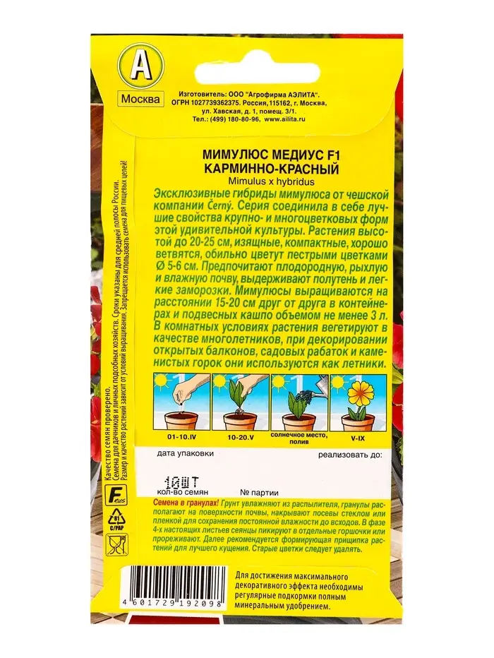 Семена цветов Мимулюс Медиус F1 карминно-красный (драже) С. Cerny Цветущий балкон, Ц/П,10 шт. 10945