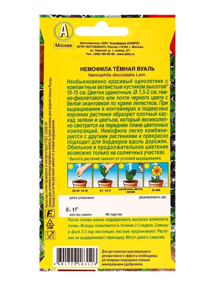 Семена цветов Немофила Темная вуаль Цветущий балкон, Ц/П,0,1 г