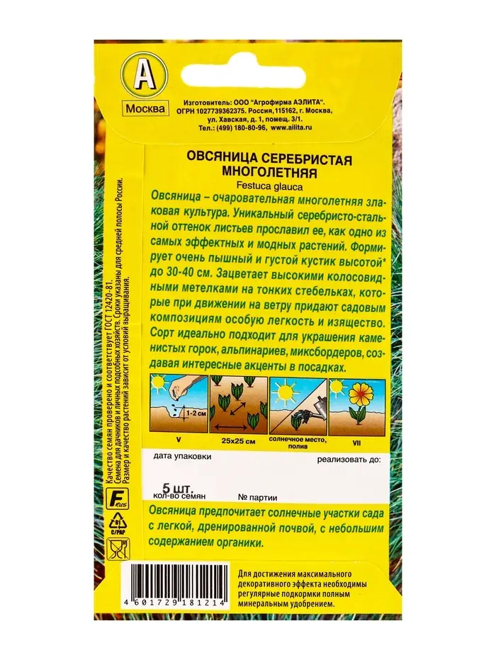 Семена цветов Овсяница Серебристая многолетняя Мн, Ц/П,5 шт.