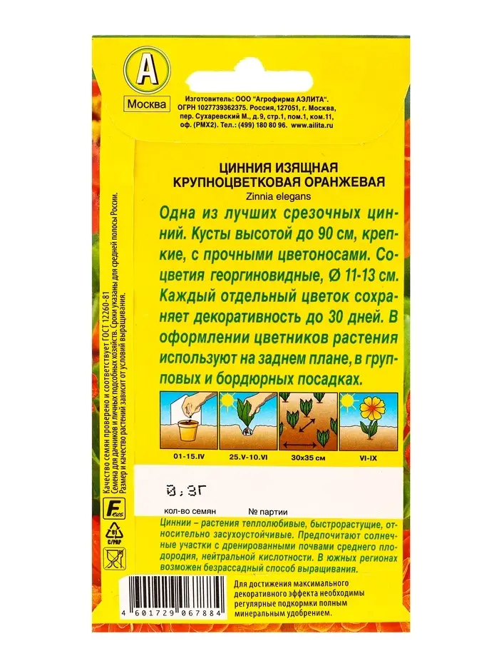 Семена цветов Цинния Крупноцветковая оранжевая , Ц/П,0,3 г