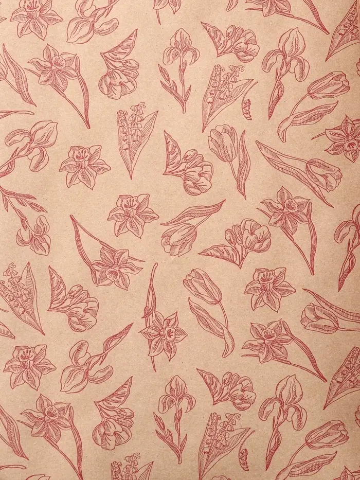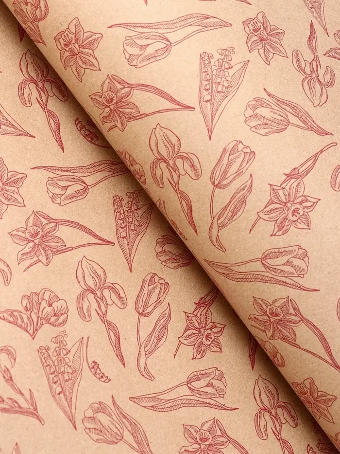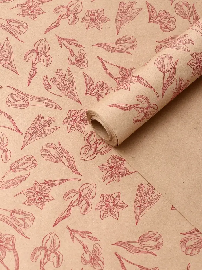 Крафт бумага "Ирисы" красный цв. на коричневом фоне 0,72 х 10 ±5% м, 60 гр