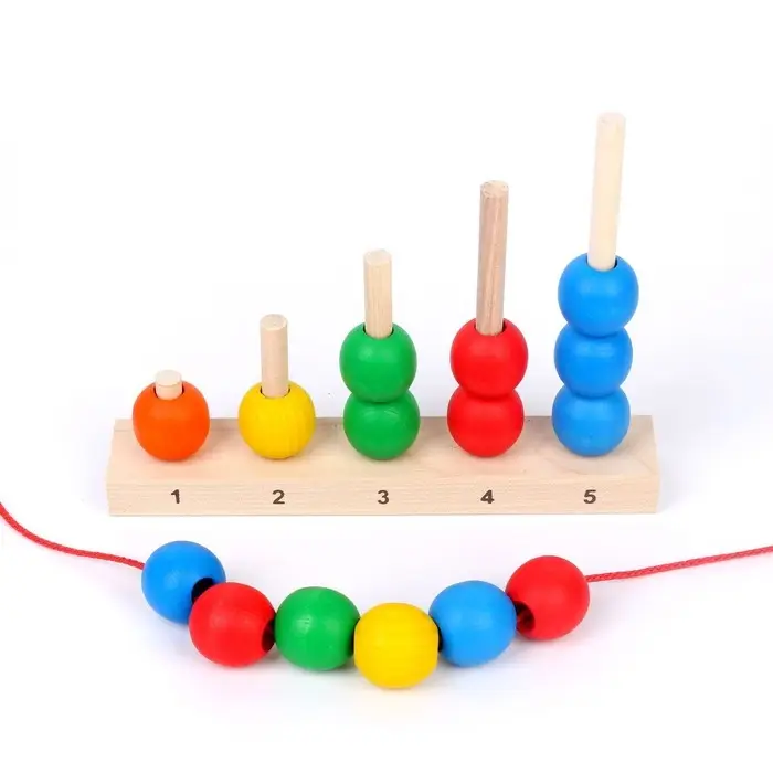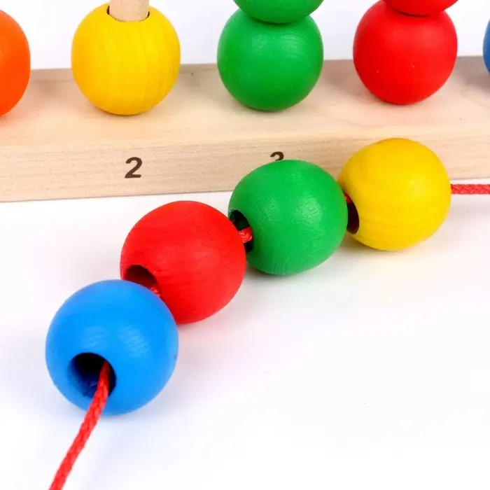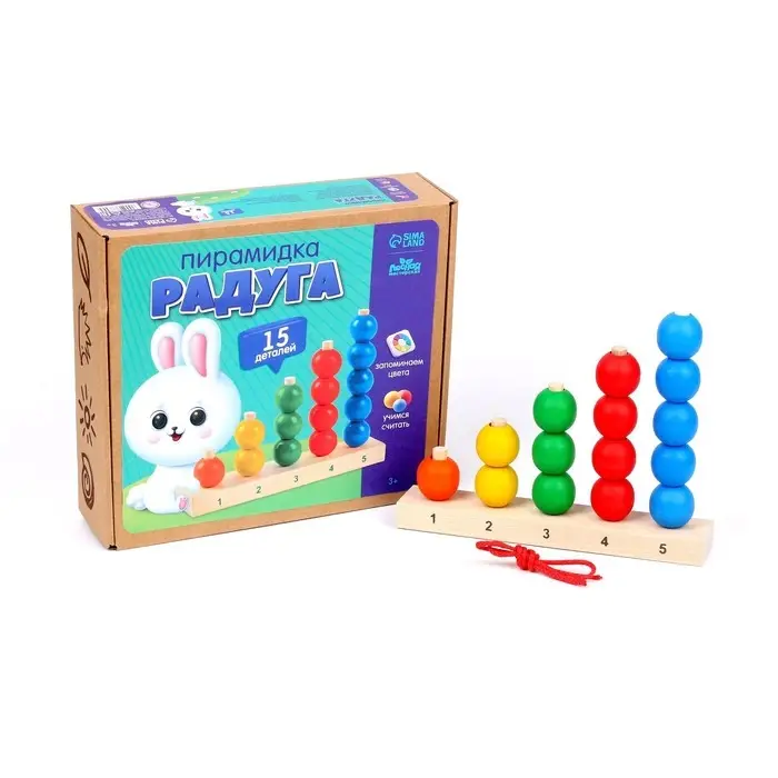 - Включает 15 разноцветных шариков, выполненных из натурального дерева, которые можно надевать на штырьки или нанизывать на шнурок, который идёт в комплекте.