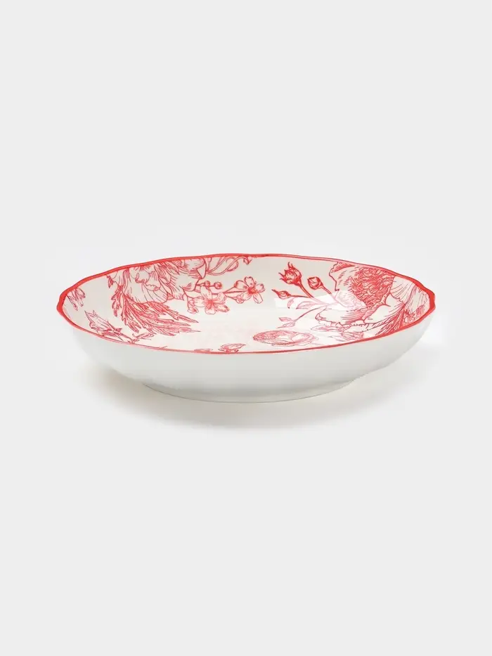 Плоская фарфоровая тарелка Botanica диаметром 18,5 см — лаконичный выбор для тех, кто ищет изящную посуду с характером. Белый фон подчёркивает насыщенный красный растительный орнамент, выполненный в технике деколи, а компактный формат делает изделие универсальным: от завтрака до лёгкого ужина или стильной подачи закусок. Гладкая глазурованная поверхность сохраняет блеск даже после многократного использования.