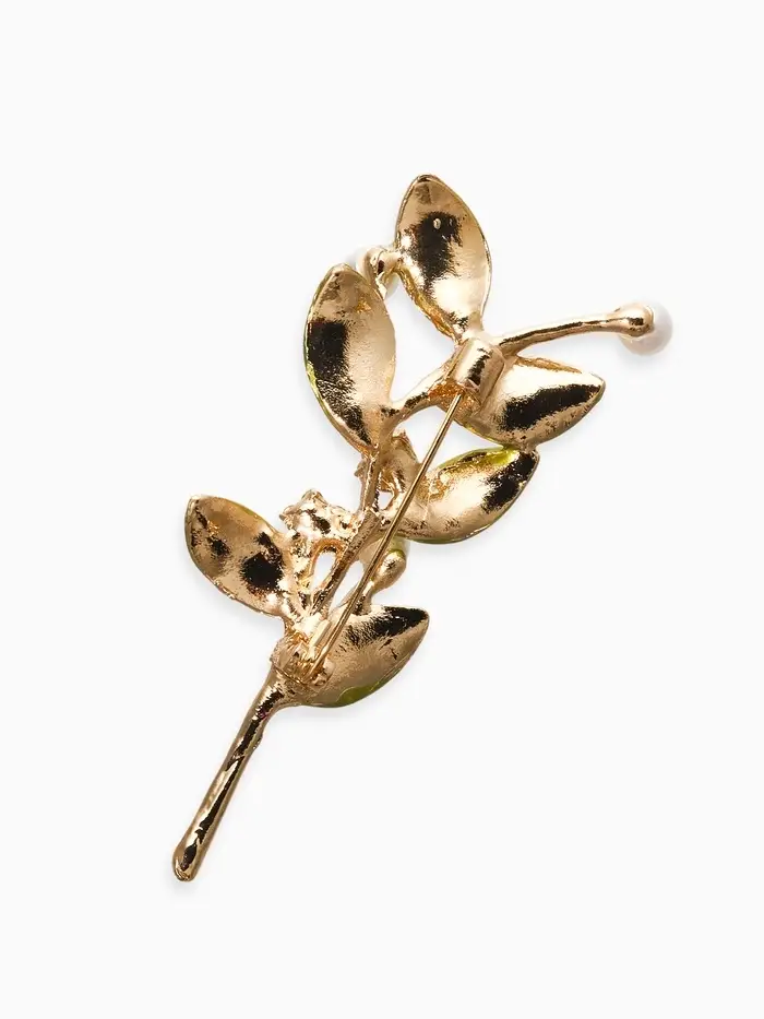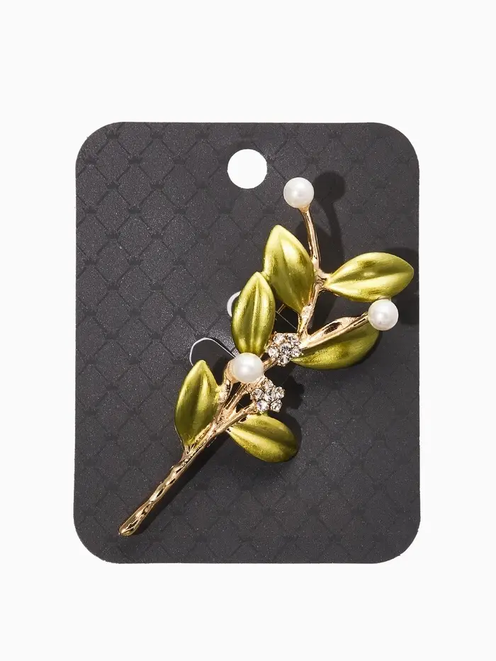 Брошь "Веточка с жемчугом", цвет бело-зелёный в золоте