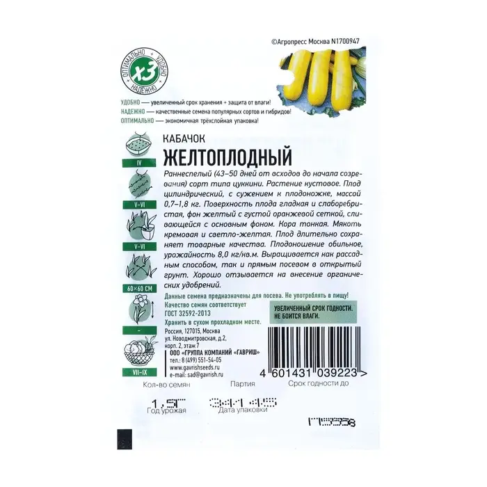 Семена Кабачок "Желтоплодный", 1,5 г серия ХИТ х3