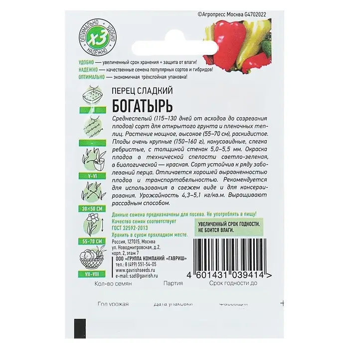 Семена Перец сладкий "Богатырь", среднеспелый, 0,1 г серия ХИТ х3