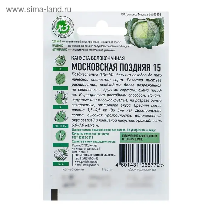 Семена Капуста белокочанная "Московская поздняя 15", для квашения, 0,1 г серия ХИТ х3