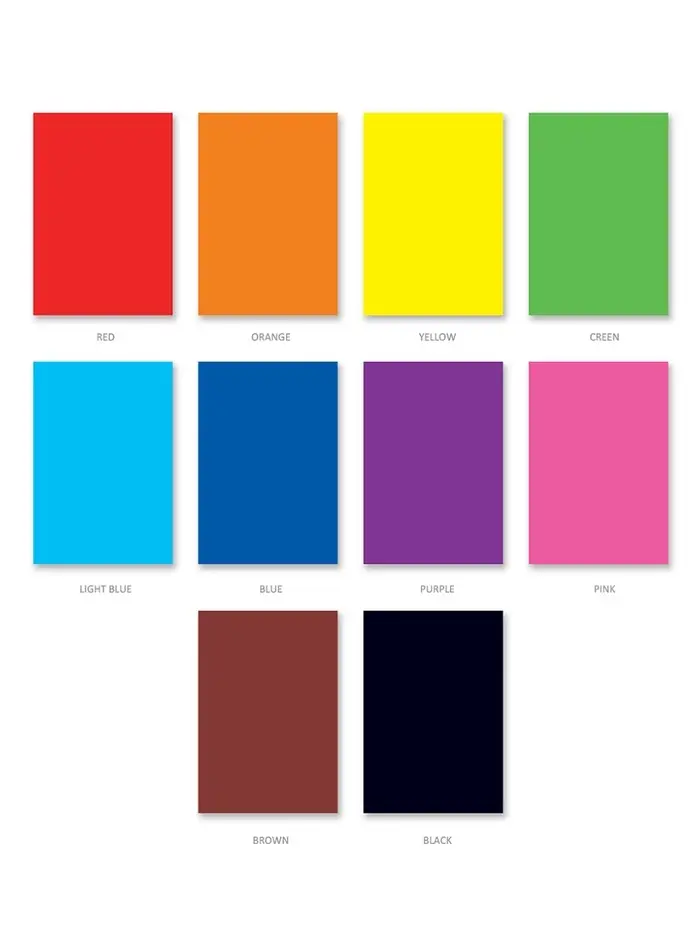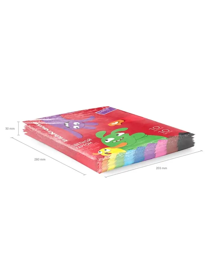 Цветной картон глянцевый односторонний формата А4 (203х280 мм). В наборе 10 листов 10 базовых цветов (красный, оранжевый, желтый, зеленый, голубой, синий, фиолетовый, розовый, коричневый, черный). Плотность наполнения — 170 г/м2. Тип скрепления — клей. На внутренней стороне обложки приводятся инструкции по изготовлению поделок. Упакована в термоусадочную пленку по 10 штук.