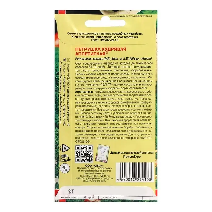 Семена Петрушка кудрявая "Аппетитная", 2 г