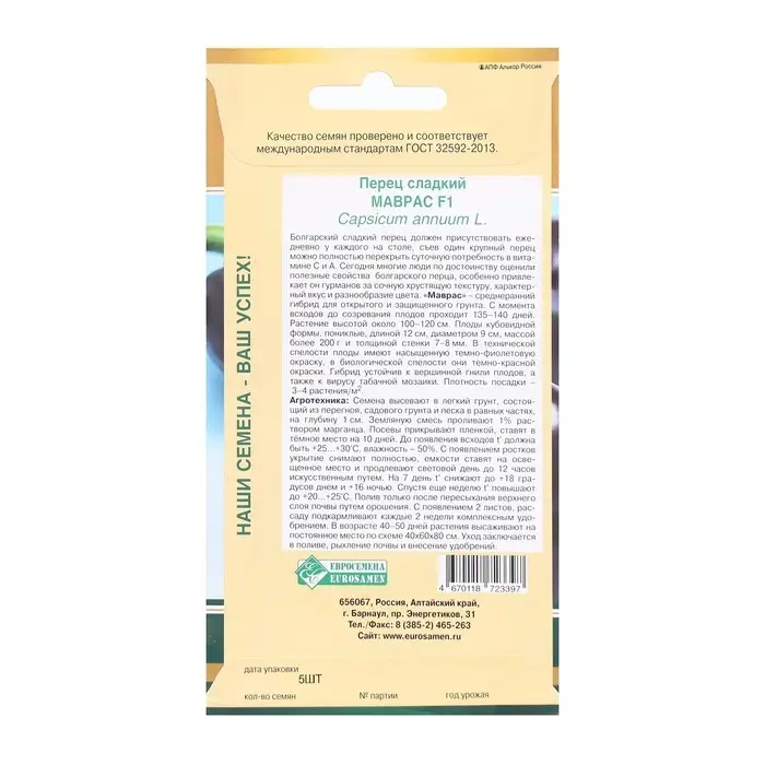 Среднеспелый, высокоурожайный (120-130 дней от всходов до технической спелости), гибрид с хорошей завязываемостью плодов. Растение среднерослое, для выращивания в теплицах и открытом грунте. Плоды кубовидные, пониклые, массой 190-210 г, с толщиной стенок 7-9 мм, в технической спелости темно-фиолетовые в биологической темно-красные. Вкусные, ароматные перцы отлично подходят для употребления в свежем виде, овощных салатов, домашних заготовок и кулинарии. Глубина заделки семян в грунт не более 1 см. Нельзя высаживать рассаду сладких и острых сортов перца рядом, т.к. происходит переопыление и сладкий перец приобретает горький вкус.