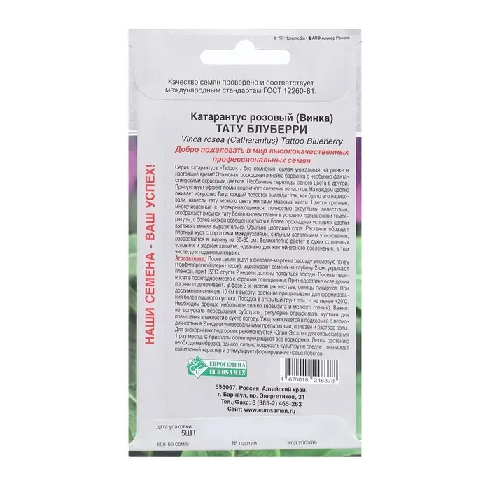 Семена Цветов Катарантус розовый, Винка Тату Блуберри, 5 шт