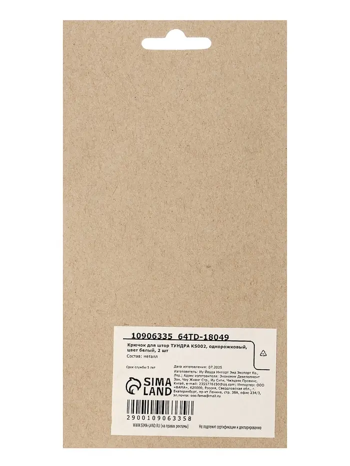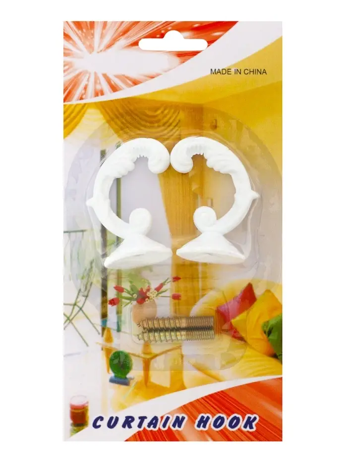 Крючок для штор ТУНДРА KS002, однорожковый, цвет белый, 2 шт
