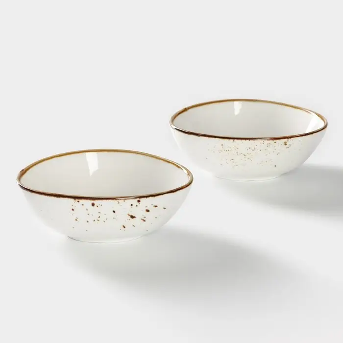 Салатники «Церера» от Magistro — пара белых фарфоровых ёмкостей с точечным рисунком для подачи как холодных, так и горячих блюд. Объём 440 мл и глубина 5,5 см позволяют разместить порцию салата, тёплую закуску или гарнир, не опасаясь перелива. Гладкая глазурованная поверхность легко моется, в том числе в посудомоечной машине, а фарфор выдерживает нагрев в СВЧ без потери внешнего вида.