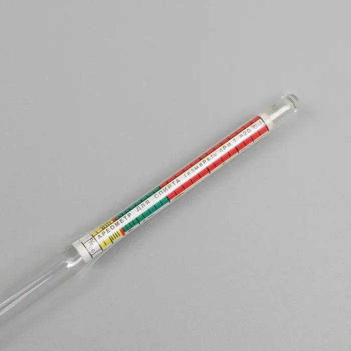 Граница погружения на мерной шкале будет являться индикатором крепости напитка. Диапазон значений величины: от 0 до 96 %.