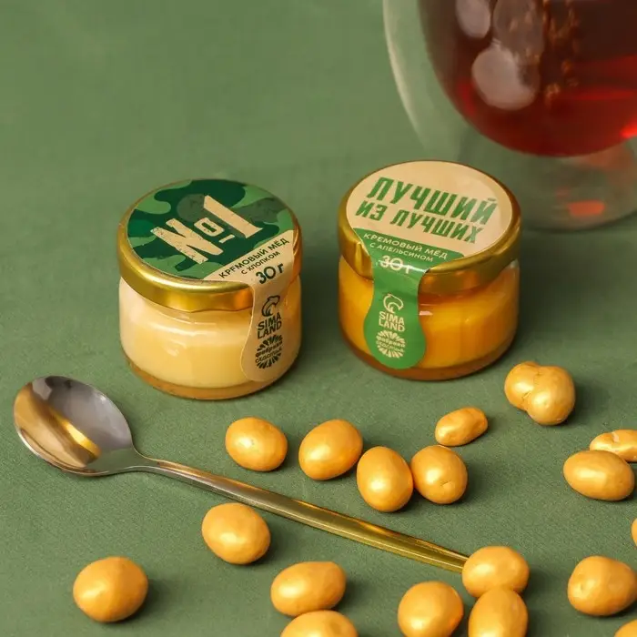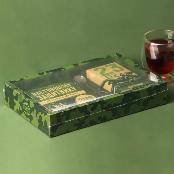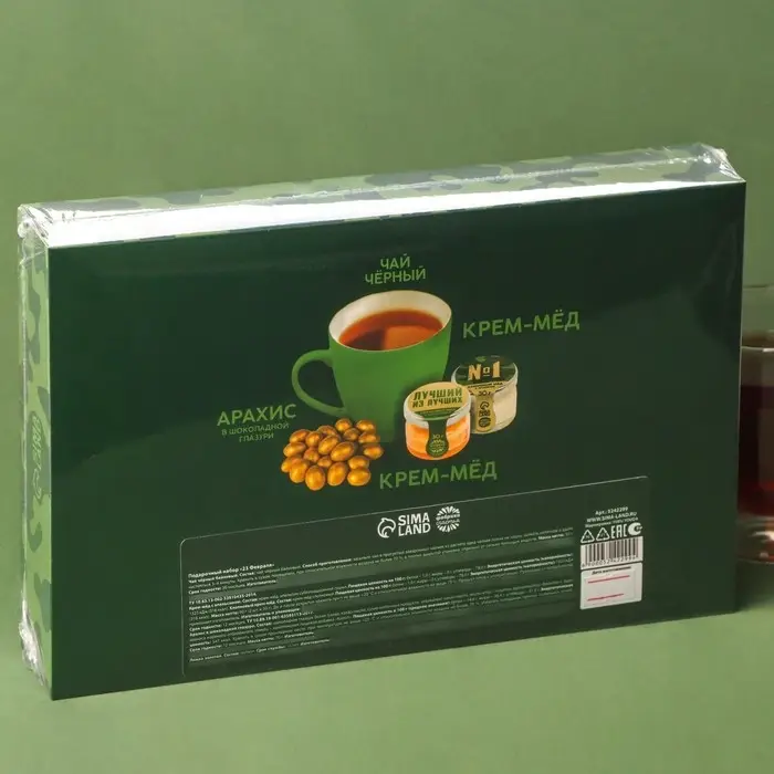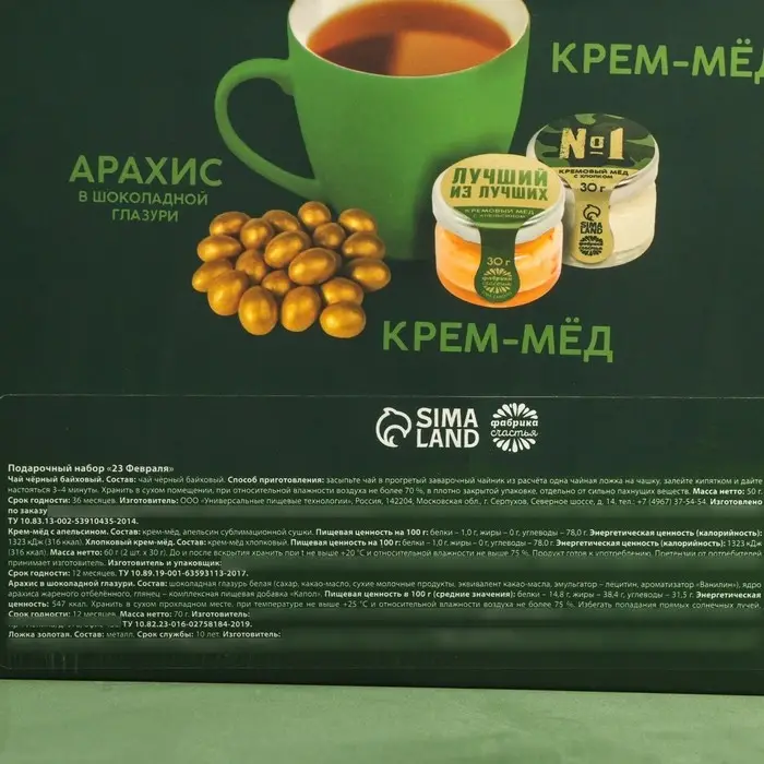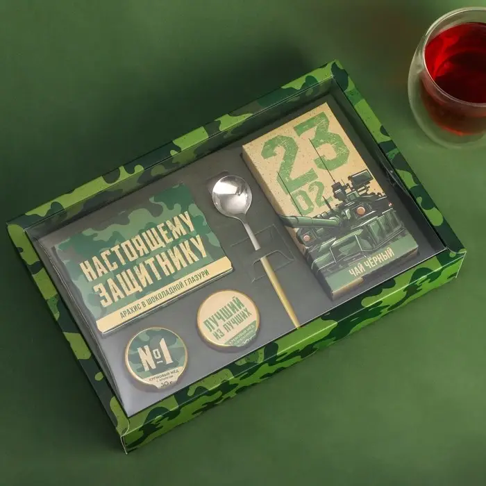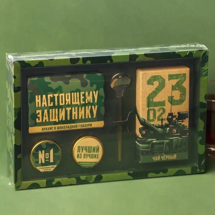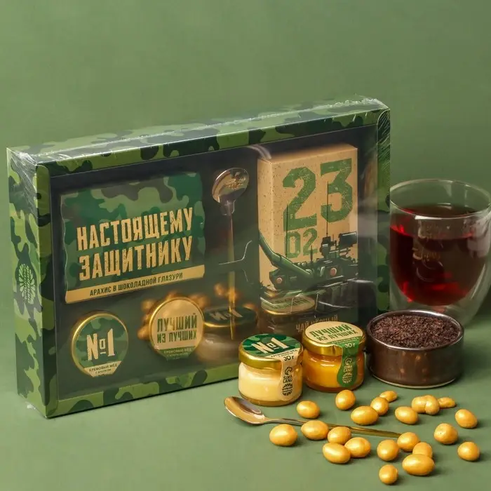 Набор «23 Февраля»: крем-мед, орехи в шоколадной глазури, чай, ложка