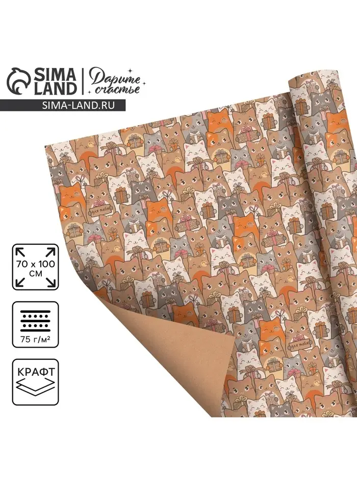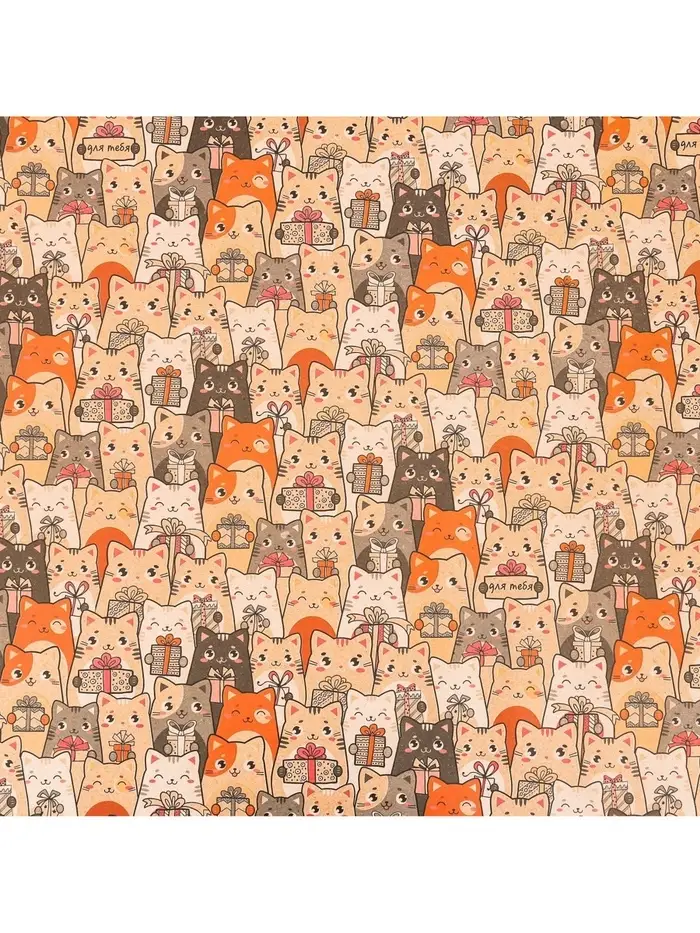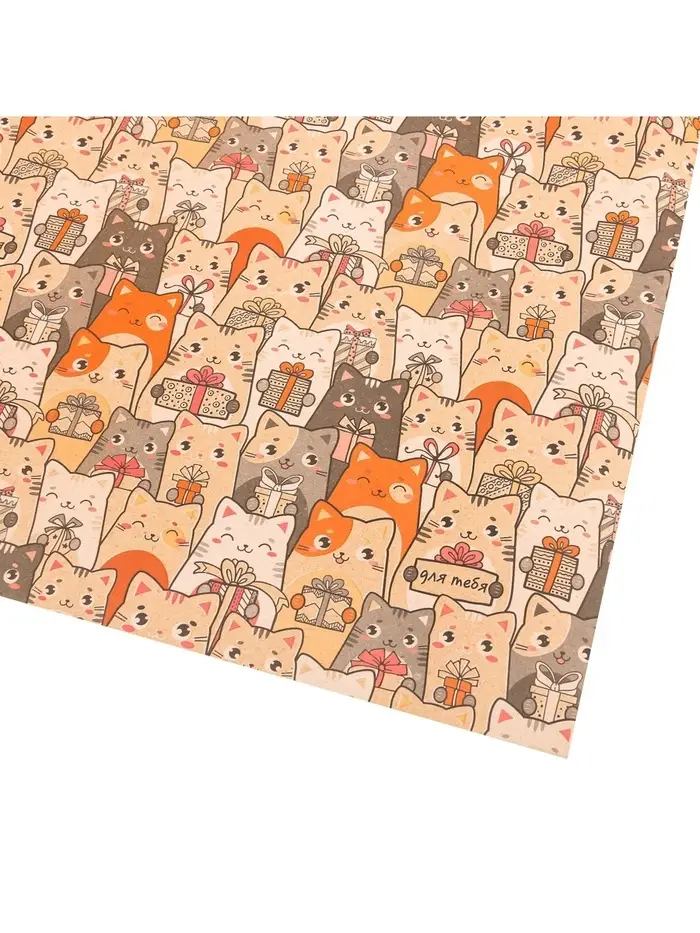 Бумага упаковочная крафтовая «Котики с подарками», 70 х 100 см