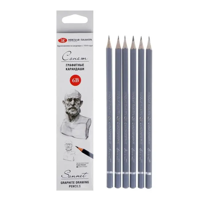 Карандаши "Сонет" идеальны для создания набросков, чертежей и других графических работ любой сложности. Изготовлены из высококачественного прочного графита в шестигранном корпусе из древесины липы диаметром 6,9 мм. Оптимальная толщина стержня позволяет создавать разнообразные эффекты. Карандаши отличаются гладкостью нанесения штриха, легко затачиваются. В набор входят карандаши твердостью 6В. Цветовая градация в дизайне корпуса карандашей обеспечивает комфортную работу.