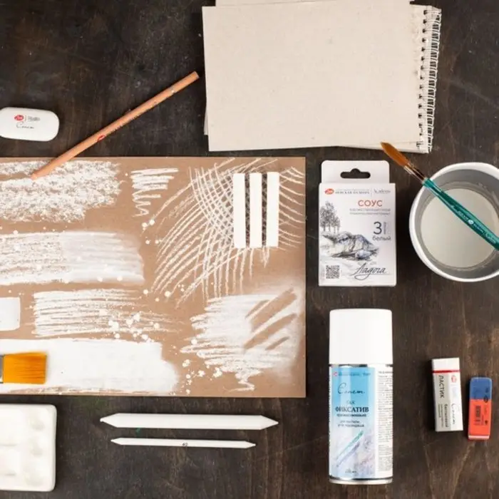 Сухой художественный графический материал соус белый предназначен для выполнения графических и живописно-графических работ на бумаге, крафте, тонированной бумаге. Наносится штриховкой и легко растушёвывается по поверхности бумаги. При необходимости, штриховка размывается влажной кистью.