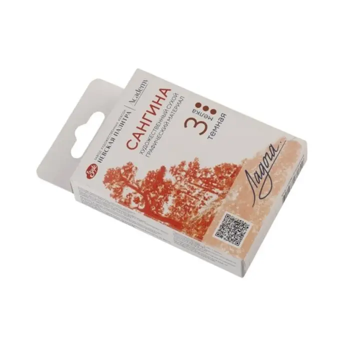 Сухой художественный материал сангина тёмная предназначен для выполнения графических работ на бумаге, крафте, тонированной бумаге. Сангина наносится штриховкой и легко растушёвывается по поверхности бумаги. Для внесения исправлений в рисунок сангина удаляется с поверхности бумаги стирательной резинкой, формопластом или клячкой. Для долговечного хранения завершенные работы требуют дополнительного закрепления лаком фиксативом. Длина стержня - 65 мм. Диаметр - 10 мм. Состав сангины: наполнитель, пигмент, добавки. Гарантийный срок - 5 лет с даты изготовления. Хранить в сухом закрытом помещении, при температуре от 0 °С до 40 °С и относительной влажности воздуха не выше 60 %. Комплектация набора: сангина тёмная 3 мелка, поролоновый ложемент, поролоновый защитный слой, картонная коробка с европодвесом. Производство ЗХК "Невская палитра".