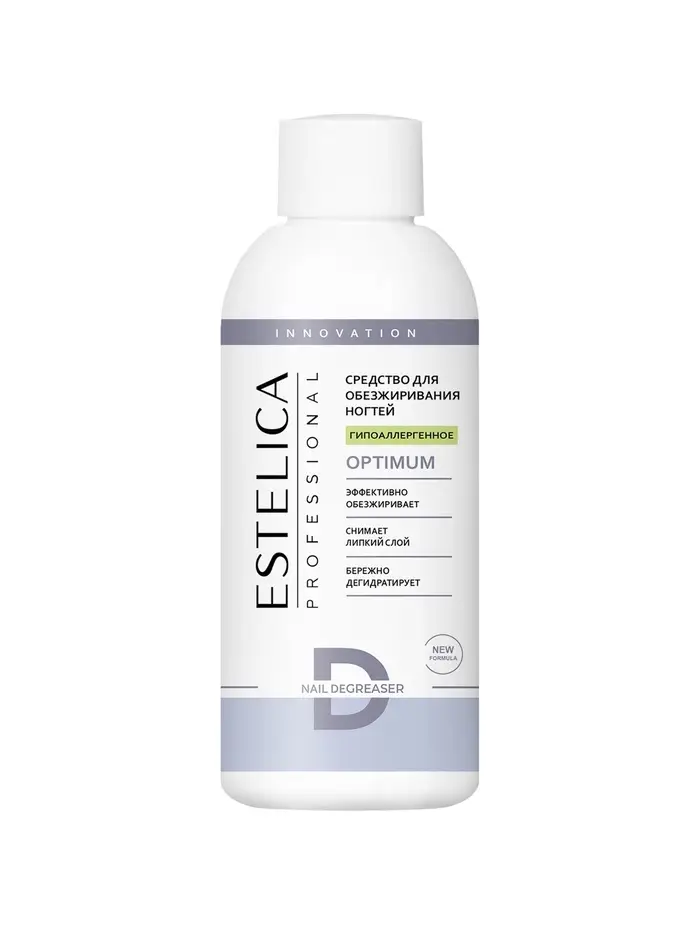 ESTELICA PROFESSIONAL OPTIMUM, гипоаллергенное средство для обезжиривания и снятия липкого слоя 150 мл (16 шт.) — профессиональное средство, обеспечивающее надёжное сцепление материалов с ногтевой пластиной и предотвращающее сколы и отслоения покрытия. Эффективно удаляет дисперсионный (липкий) слой и дегидратирует ногтевую пластину, что делает его идеальным для работы с натуральными и искусственными ногтями перед нанесением акрила, геля или лака.