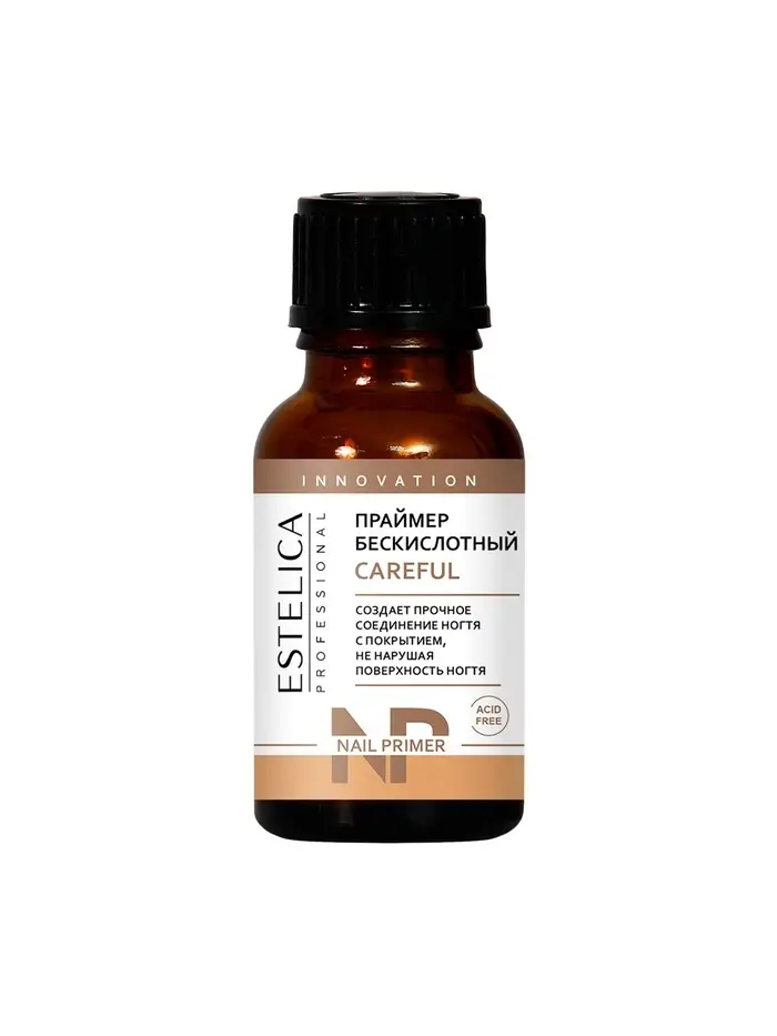 ESTELICA PROFESSIONAL CAREFUL, бескислотный праймер 15 мл (20 шт.) — профессиональное средство для усиления адгезии и надёжного соединения ногтевой пластины с искусственными материалами, такими как гель-лак, гель или акрил. Праймер создаёт тонкую защитную пленку на поверхности ногтя, которая обеспечивает прочное сцепление и предотвращает образование сколов и отслоений.