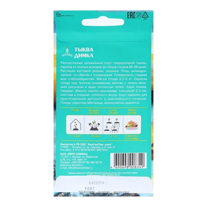Семена Тыква Димка цв/п 10шт, раннеспелая, цилиндрическая, мякоть светло-оранжевая, массой д