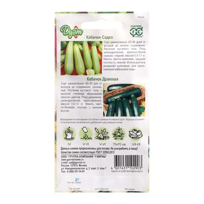 Семена Кабачок "Дракоша" 1,0 г + "Садко" 1,0 г, серия Дуэт