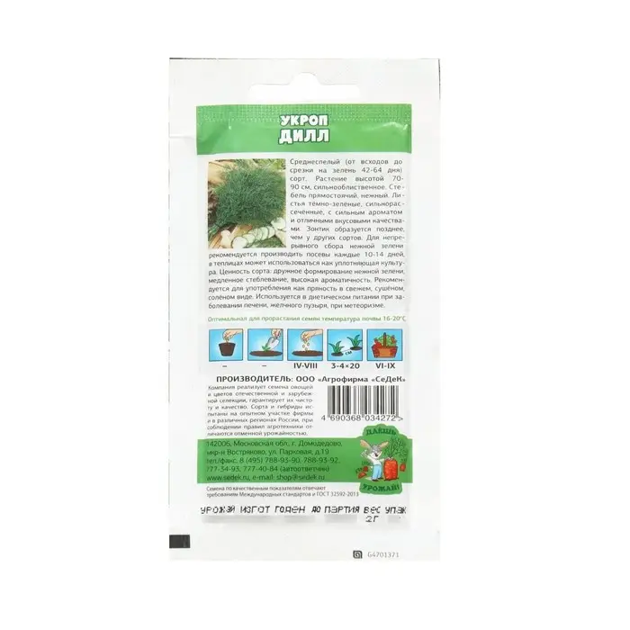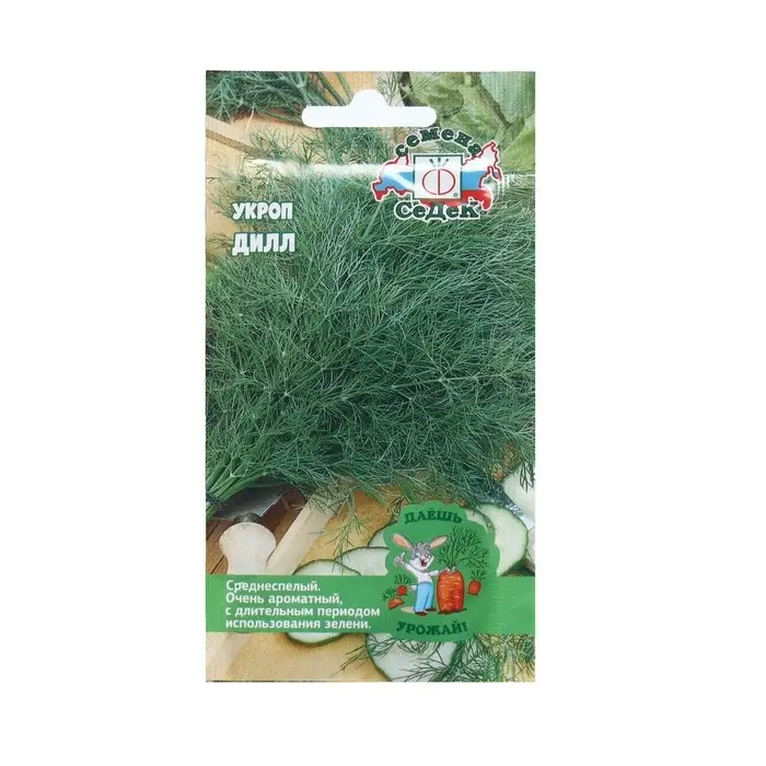 Средне-ранний сорт укропа. Период от всходов и до первого среза 35-45 дней. При этом мы получаем, очень ароматный, укроп приятно-зеленого цвета. Листья крупные, сильно рассеченные, нежные, темно-зеленого цвета, с изумительным насыщенным ароматом. К стеблеванию переходит медленно, долго сохраняет товарную пригодность в технической спелости, имеет очень привлекательный вид. Предназначен для переработки (сушки) и свежего потребления. Рекомендовано для профессионального выращивания в открытом и защищенном грунте. Для использования на специи можно использовать в период 80-85 дней.