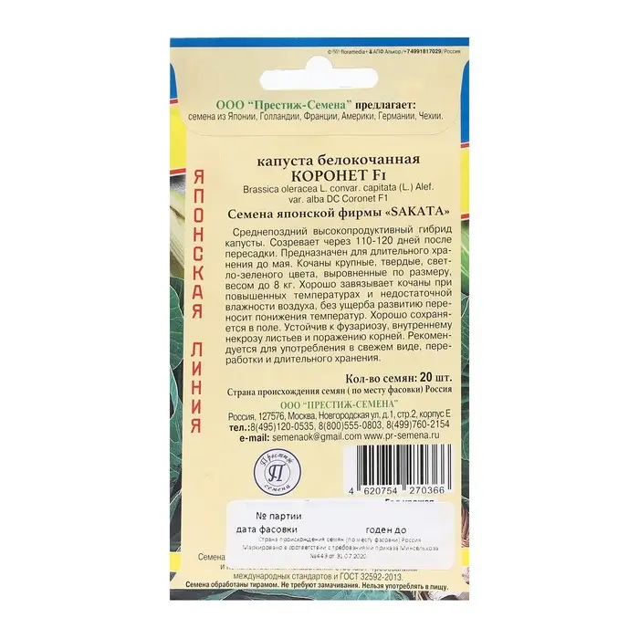 Семена Капуста белокачанная "Коронет F1", 20 шт