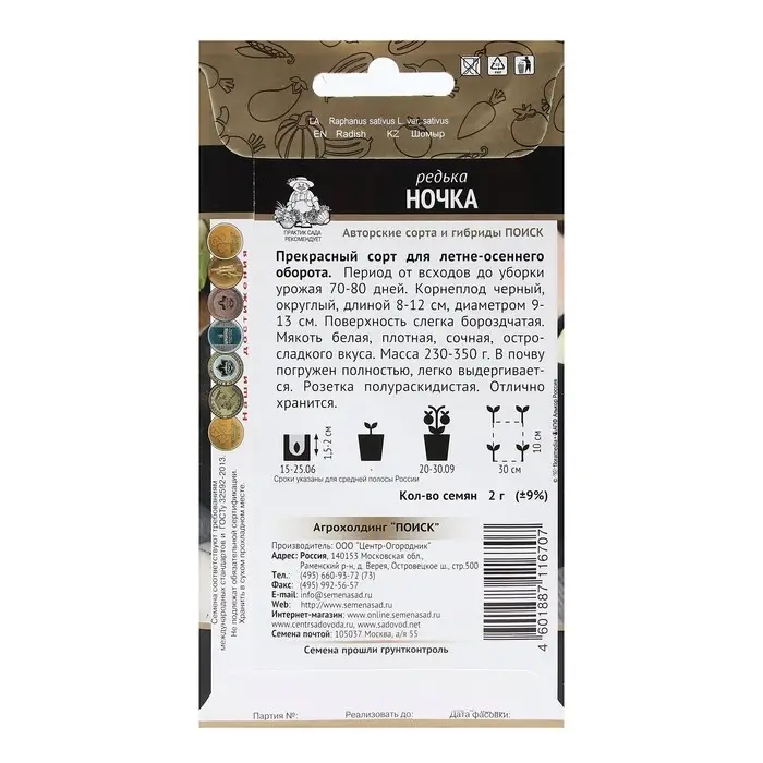 Прекрасный сорт для летне-осеннего оборота. Период от всходов до уборки урожая 70-80 дней. Корнеплод черный, округлый, длиной 8-12 см, диаметром 9-13 см. Поверхность слегка бороздчатая. Мякоть белая, плотная, сочная, остро-сладковатого вкуса. Масса 230-350 г. В почву погружен полностью, легко выдергивается. Розетка полураскидистая. Отлично хранится.