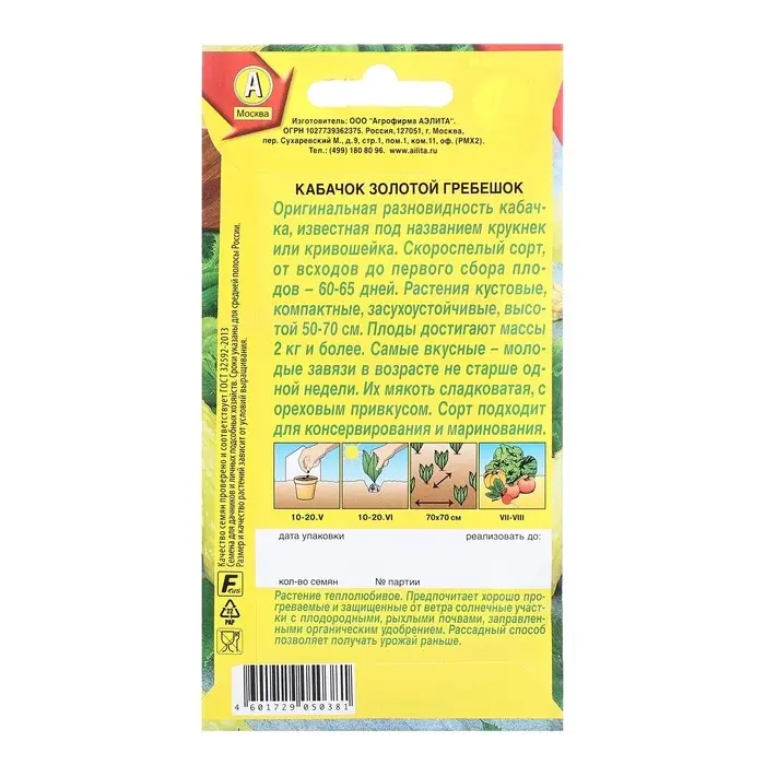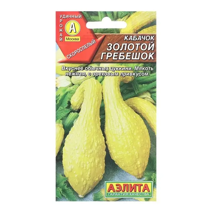 Оригинальная разновидность кабачка, известная под названием крукнек или кривошейка. Скороспелый сорт, от всходов до первого сбора плодов - 60-65 дней. Растения кустовые, компактные, засухоустойчивые, 50-70 см высотой. Плоды достигают массы 2 кг. и более. Обычно используют в пищу молодые завязи в воздасте не старше одной недели. Сырая мякоть молодых плодов сладковатая, с ореховым привкусом.. Их употребляют также как кабачок и тыкву; возможно есть в сыром виде. Подходит для консервирования и маринования.