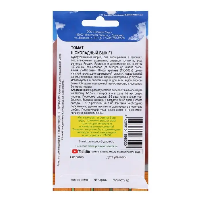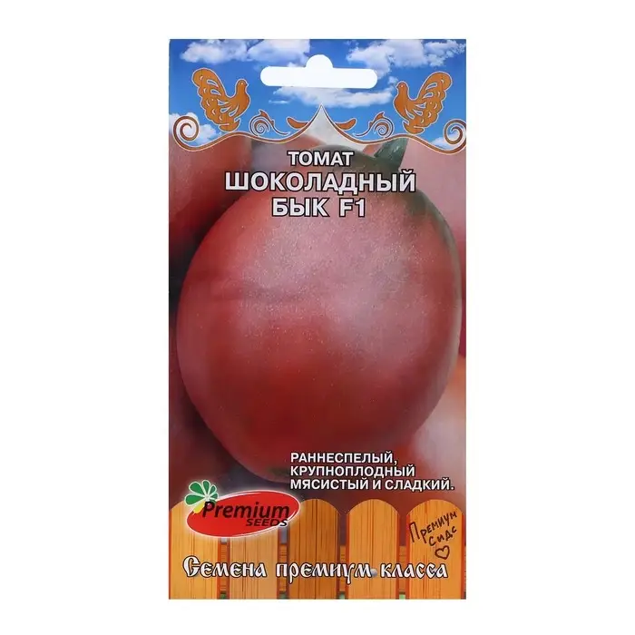 Этот шоколадный бык к холодам давно привык! Его плод громадный - нежно шоколадный!Суперурожайный гибрид, предназначенный для выращивания в теплицах и под плёночными укрытиями во всех регионах России. Растение индетерминантное, высотой 150-200 см., раннеспелое (от всходов до начала созревания 95-100 дней). Плоды очень крупные (200-300 г) оригинальной шоколадно-карамельной окраски, сердцевидной формы, мясистые, сочные, сладкие и потрясающе вкусные. Используются в свежем виде и для всех видов переработки. Обладает повышенной выносливостью основным болезням томата. Агротехника: На рассаду семена высевают в начале марта на глубину 1-1,5 см. Пикировка - в фазе 1-2 настоящих листьев. Подкормка рассады 2-3 раза комплексным удобрением. Высадка рассады в возрасте 50-55 дней. Густота посадки – 3-3,5 растений на 1м2. Растения необходимо подвязывать, удалять пасынки и формировать в один-два стебля. Последующий уход заключается в подкормках, поливах и рыхлении почвы.