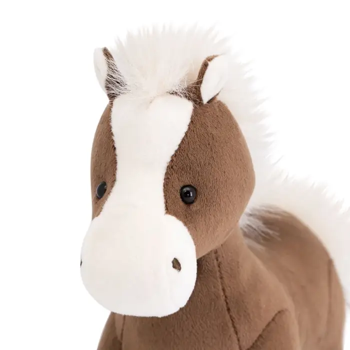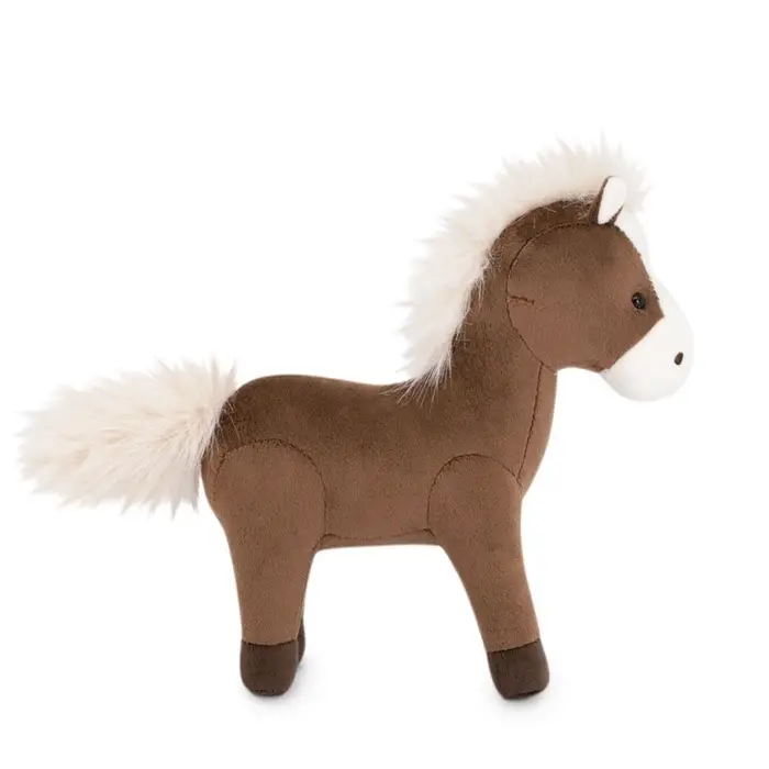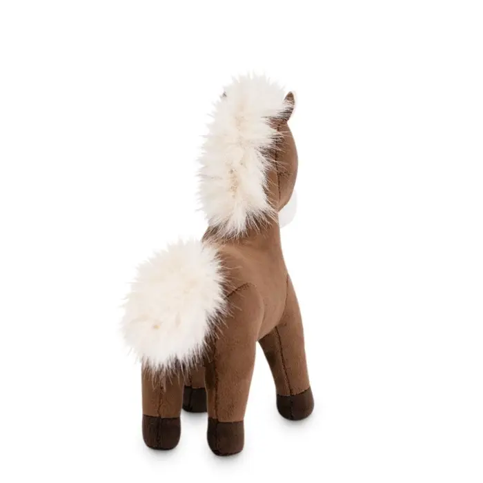 - Игрушка выполнена в виде доброй лошадки с мягкой текстурой и яркими деталями: пушистой белой гривой и блестящими глазами.