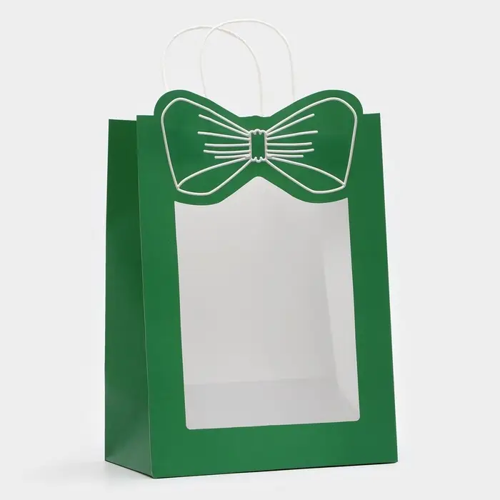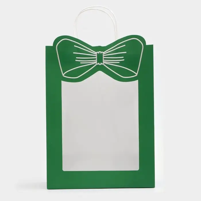 Пакет подарочный бумажный с окном «Бант», 26×35×15 см, крафт зеленый