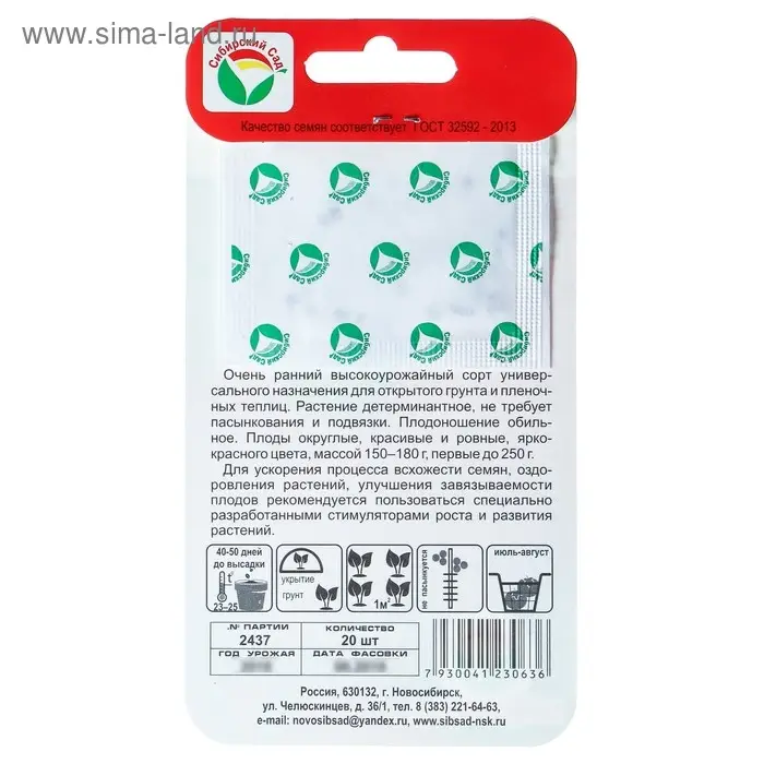 Очень ранний высокоурожайный сорт универсального назначения для открытого грунта и пленочных теплиц. Растение детерминантное, не требует пасынкования и подвязки. Плодоношение обильное. Плоды округлые, красивые и ровные, ярко- красного цвета, массой 150-180 г, первые до 250 г.