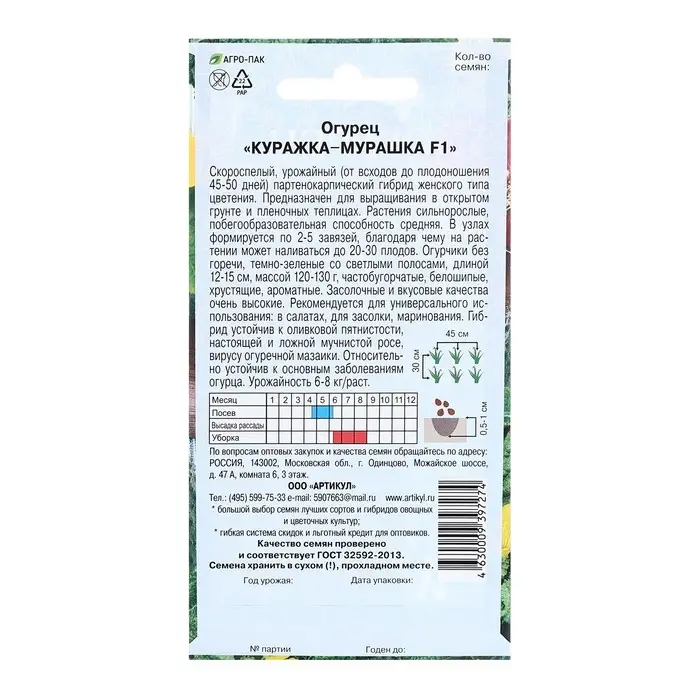 Скороспелый (43-48 дней от всходов до плодоношения) партенокарпический гибрид преимущественно женского типа цветения для пленочных укрытий. Имеет ограниченный рост боковых побегов, что удобно при формировке. Зеленцы длиной 10-12 см, массой 90-110 г, с крупными широкими бугорками, черношипые. В каждой пазухе листа образуется 4-6 завязей. Плоды отлично подойдут для бочковой засолки, маринования и приготовления свежих салатов. Гибрид устойчив к настоящей мучнистой росе, относительно устойчив к ложной мучнистой росе и корневым гнилям. Урожайность одного растения 6,0-7,0 кг. Посев на рассаду — в мае. Высадка в грунт — в конце мая-начале июня в фазе 3-4-х настоящих листьев. Посев непосредственно в грунт — в конце мая-начале июня. Схема посадки: 50х50 см. Семена после уборки сохраняют всхожесть в течение 7 лет при оптимальных условиях хранения. Рекомендуется увеличить норму высева по истечение срока годности.