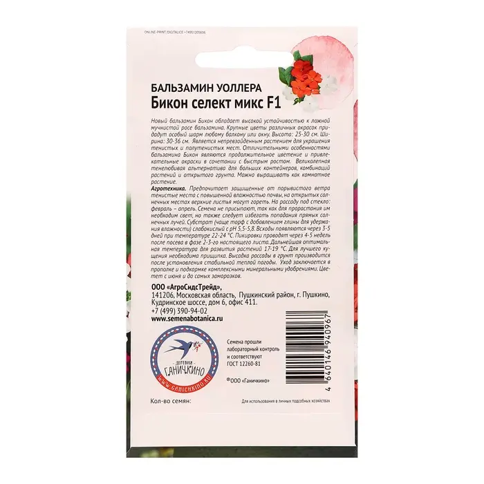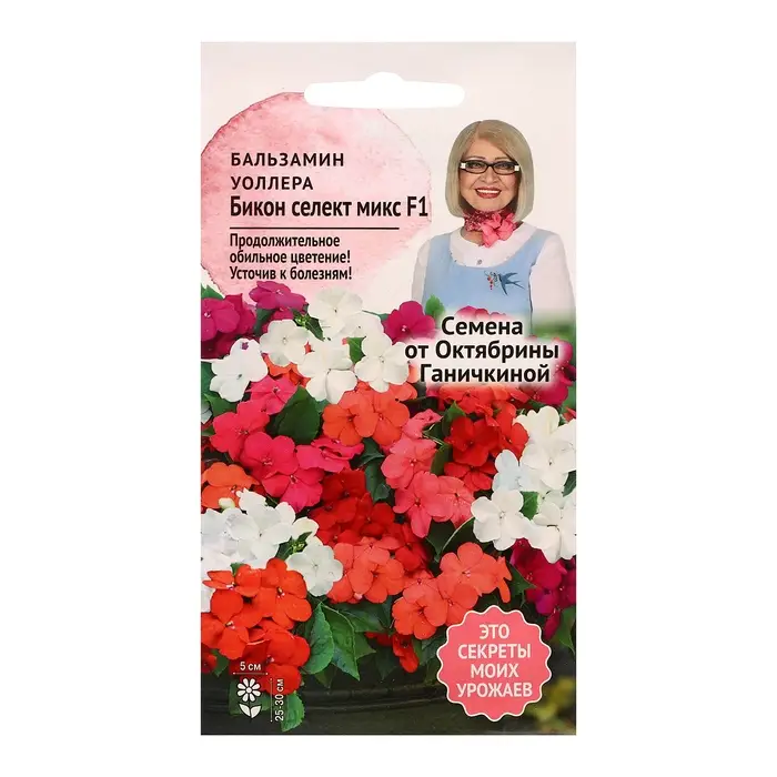 Новый бальзамин Бикон обладает высокой устойчивостью к ложной мучнистой росе бальзамина. Крупные цветы различных окрасок придадут особый шарм любому балкону или окну. Высота: 25-30 см Ширина: 30-36 см. Является непревзойденным растением для украшения тенистых и полу- тенистых мест. Отличительной особенностью бальзамина Акила является продолжительное цветение и привлекательные окраски, в сочетании с быстрым ростом. Великолепная тенелюбивая альтернатива для больших контейнеров, комбинаций растений и открытого грунта. Можно выращивать как комнатное растение. Агротехника: предпочитает защищенные от порывистого ветра тенистые места с повышенной влажностью почвы, на открытых солнечных местах верхние листья могут гореть. На рассаду под стекло февраль – апрель. Семена не присыпают, так как для прорастания им необходим свет, но также следует избегать попадания прямых солнечных лучей. Субстрат (чаще торф с добавлением глины для удержания влажности) слабокислый с рН 5,5-5,8. Всходы появляются через 3-5 дней при температуре 22-24°С. Пикировки проводят через 4-5 недель после посева в фазе 2-3-го настоящего листа. Дальнейшая оптимальная температура для развития растений 17-19°С. Для лучшего кущения необходима прищипка. Высадка рассады в грунт производится после установления стабильной теплой погоды. Уход заключается в прополке и подкормке комплексными минеральными удобрениями. Цветет с июня и до самых заморозков. Штрих-код -