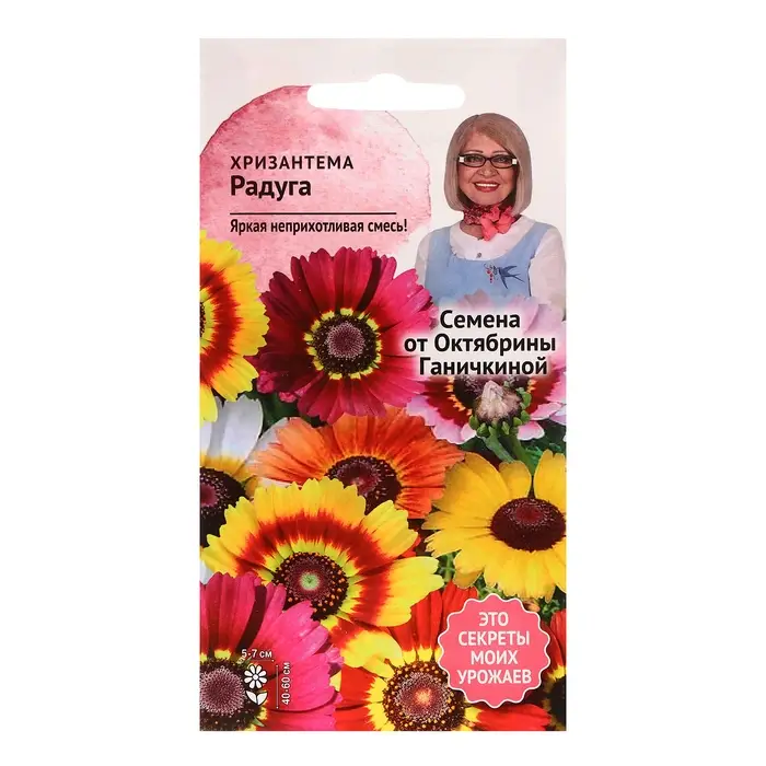 Однолетник. Куст прямостоячий, разветвленный, с ажурной ярко-зеленой листвой, высотой 40-60 см. Соцветия ромашковидные, простые и полумахровые, диаметром 5-7 см, разнообразных ярких окрасок. Цветение обильное, длится с июля по сентябрь. Используют для посадки в сборные цветники, рабатки, клумбы, а также для срезки. Агротехника: Хризантема – холодостойкое, засухоустойчивое, светолюбивое растение, предпочитает плодородные, хорошо дренированные почвы. Семена высевают в открытый грунт в мае или в августе под зиму. На рассаду посев проводят в марте. Температура прорастания семян 18 °С. Всходы появляются через 7-10 дней. Сеянцы пикируют. После закаливания рассаду высаживают на постоянное место по схеме 35x40 см. Уход заключается в своевременных поливах, подкормках, рыхлении. Для лучшего ветвления молодые растения прищипывают. Штрих-код - 4650091480418